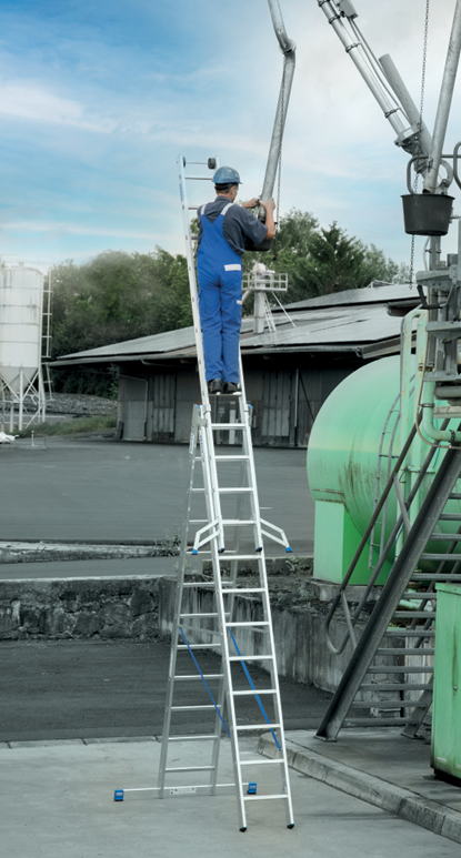 Dreiteilige Aluminium-Vielzweckleiter für professionelle Ansprüche, einsetzbar als Anlege-, Schiebe- und Stehleiter mit ausschiebbarem und einzeln herausnehmbarem Leiternteil.